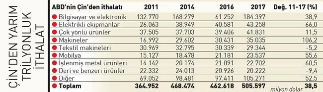 ABD'nin bu hamleleri atmasının sebebi olan dış ticaret açığına bakıldığında 2017'de rakamın 375 milyar doları bulduğu görülüyor. Büyük bir bölümü ise Çin'den geliyor. ABD'nin Çin'e ihracatı 130 milyar dolarken Çin'den ithalatı 506 milyar doları buluyor.