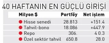 Merkez Bankası tarafından dün açıklanan verilere göre 2-9 Kasım tarihleri arasındaki haftada yabancılar 151.7 milyon dolarlık hisse, 447.9 milyon dolarlık tahvil aldı. Repo ve özel sektör borçlanma araçları ile birlikte Türkiye'ye bir haftalık yabancı girişi 627.6 milyon dolarla 19-26 Ocak 2018 haftasından bu yanaki en yüksek seviyeye ulaştı.