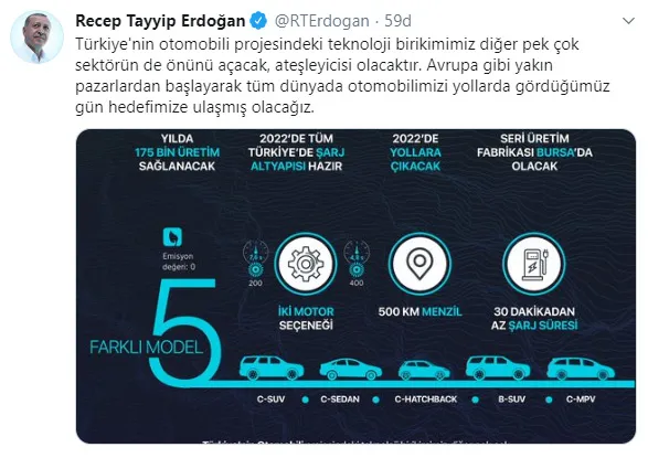 Cumhurbaşkanı Erdoğan, Twitter hesabından, bugün tanıtımı yapılan "Türkiye'nin Otomobili"ne ilişkin bilgilerin yer aldığı infografiyi paylaştı.