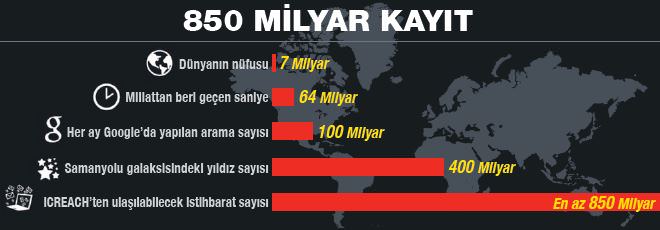 850 milyar adet kayıtla başa çıkamayan ABD gizli servisleri, kendilerine özel Google benzeri gizli bir arama motoru geliştirdi. Ajanlar ICREACH üzerinden istedikleri istihbarat bilgisine anında ulaşıyor