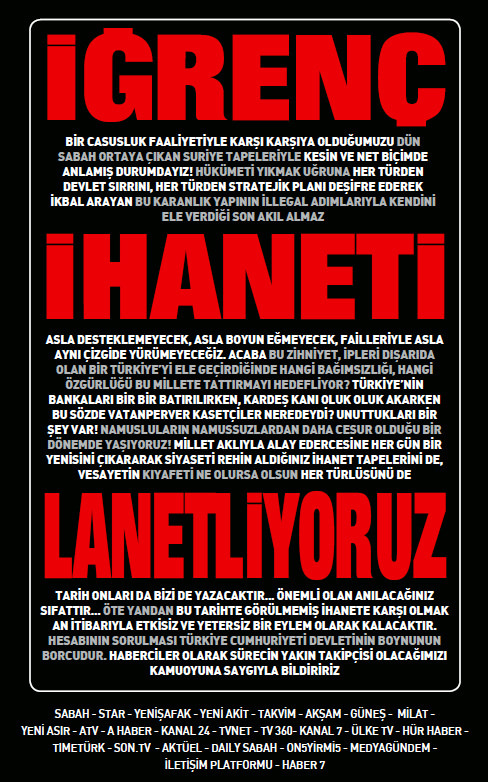 Dışişleri Bakanlığı'nda gerçekleştirilen Suriye toplantısını hedef alan eşi görülmemiş vatana ihanet hamlesi karşısında tek yürek olan medya devleri, ortak bir bildiri ile "iğrenç ihaneti lanetlediklerini" duyurdu.