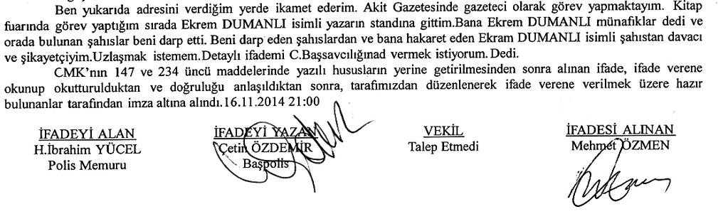 Büyükçekmece Emniyet Müdürlüğü'ne dilekçe veren Mehmet Özmen " Kitap fuarında görev yaptığım sırada Ekrem Dumanlı isimli yazarın standına gittim. Bana Ekrem dumanlı "münafıklar" dedi ve orada bulunan şahıslar beni darp etti. Beni darp eden şahıslardan ve bana hakaret eden Ekrem Dumanlı isimli şahıstan davacı ve şikayetçiyim. Detaylı ifademi C.Başsavcılığına da vermek istiyorum." dedi.