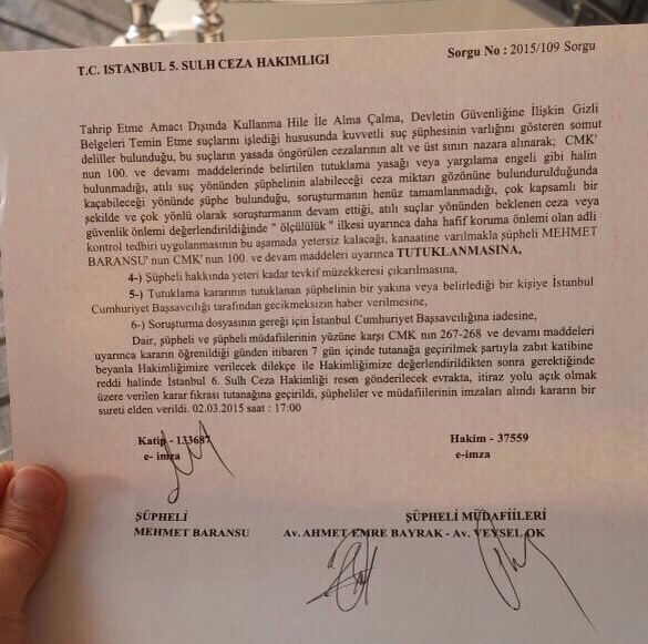 Baransu, "Suç işlemek amacıyla örgüt kurmak" ve "Devletin güvenliğine, iç veya dış siyasal yararlarına ilişkin belgeleri yok etmek", "Devletin güvenliği, iç veya dış siyasal yararları bakımından gizli kalması gereken belgeleri temin etme", "Devletin güvenliği, iç veya dış siyasal yararları bakımından gizli kalması gereken bilgileri açıklama" suçlarından sevk edildiği İstanbul 5. Sulh Ceza Hakimliğince sorgulandı.