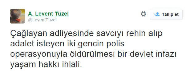 İşte o tweet; Çağlayan adliyesinde savcıyı rehin alıp adalet isteyen iki gencin polis operasyonuyla öldürülmesi bir devlet infazı yaşam hakkı ihlali.