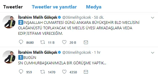"İnşallah cumartesi günü Ankara Büyükşehir Belediyesi Meclisini olağanüstü toplayacak ve meclis üyesi arkadaşlara veda edip istifamı vereceğim."