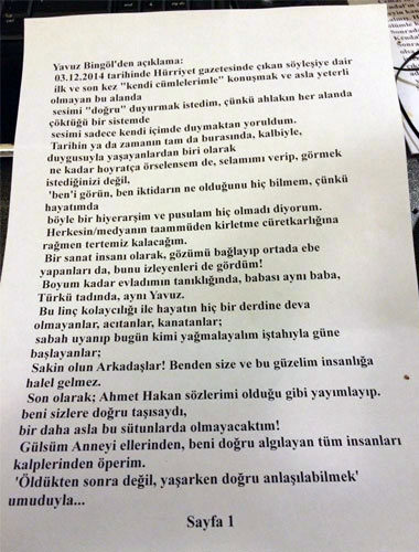 03.12.2014 tarihinde Hürriyet gazetesinde çıkan söyleşiye dair ilk ve son kez "kendi cümlelerimle" konuşmak ve asla yeterli olmayan bu alanda sesimi "doğru" duyurmak istedim, çünkü ahlakın her alanda çöktüğü bir sistemde sesimi sadece kendi içimde duymaktan yoruldum.