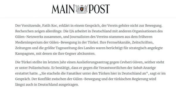 HABERDE şöyle denildi: IJA Başkanı Fatih Koç, 'Dernek Gülen Hareketi'ne bağlı değil' dedi. Ancak araştırmalar, IJA'nın Almanya'da Gülen ağına bağlı diğer örgütlerle ve Gülen Hareketi'nin Türkiye'deki eski medya imparatorluğuna bağlı çalışan gazetecilerle çalıştığını ortaya koyuyor. Gülen'e bağlı gazeteler, Gülen'in rakiplerini ortadan kaldırdığı ünlü stratejik kampanyaları ile ünlüydü." FRANKFURT