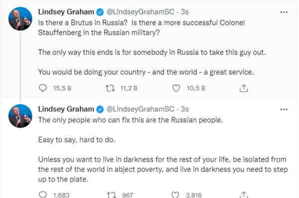 Graham, "Rusya'da bir Brütüs var mı? Rus ordusunda Albay Stauffenberg gibi başarılı biri yok mu? Bu savaşı durdurmanın tek yolu bu adamı (Putin) ortadan kaldırmak. Bu, ülkeniz ve tüm dünya için çok önemli bir hizmet olacaktır." ifadelerini kullandı.