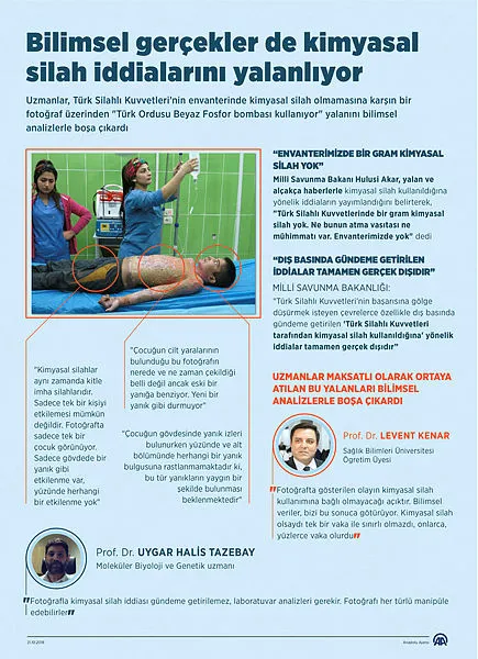 Sağlık Bilimleri Üniversitesi Kimyasal, Biyolojik, Radyolojik, Nükleer (KBRN) Anabilim Dalı Başkanı Prof. Dr. Levent Kenar, Türk Silahlı Kuvvetlerinin Barış Pınarı Harekatı'nda kimyasal silah kullandığı iddialarına ilişkin sosyal medyada paylaşılan fotoğrafları AA muhabirine değerlendirmişti.