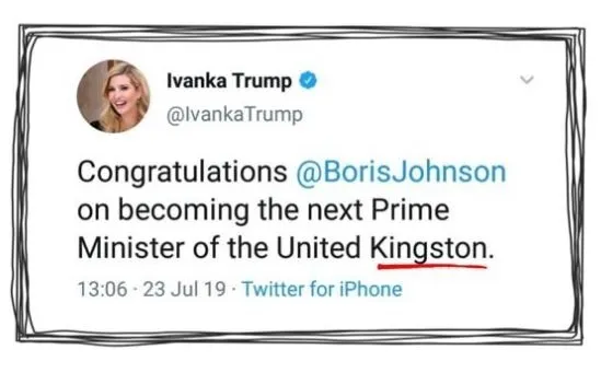 ABD Başkanı Donald Trump'ın kızı Ivanka Trump, Twitter hesabından İngiltere Başbakanı seçilen Boris Johnson için tebrik mesajı yayınladı. Mesajında United Kingdom (Birleşik Krallık) yerine United Kingston yazan Trump, takipçileri tarafından eleştiri yağmuruna tutuldu.