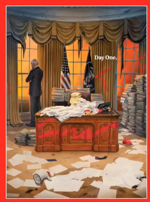 Dergi, ortalığa saçılmış resmi belgeler ve üst üste yığılmış sorunları gösteren dosyalara vurgu yaptı. Yeni Başkan ise bu dağınıklık arasında pencereden dışarı bakarken ele alındı.