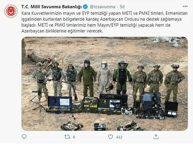 "Kara Kuvvetlerimizin mayın, el yapımı patlayıcı tespit ve imha (METİ) ile patlayıcı madde keşif ve imha (PMKİ) timleri, Ermenistan işgalinden kurtarılan bölgelerde kardeş Azerbaycan ordusuna destek sağlamaya başladı. METİ ve PMKİ timlerimiz hem mayın/EYP temizliği yapacak hem de Azerbaycan birliklerine eğitimler verecek."