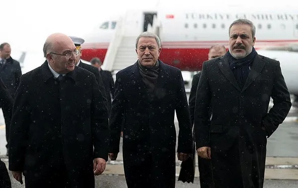 Milli Savunma Bakanı Hulusi Akar (ortada) ve Milli İstihbarat Teşkilatı (MİT) Başkanı Hakan Fidan (sağda), Türkiye'nin Moskova Büyükelçisi Mehmet Samsar (solda) tarafından karşılandı