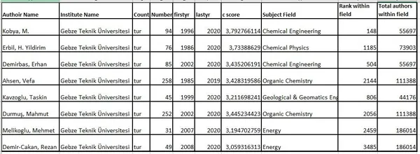 Liste hazırlanırken bilim insanlarının h-indeksi, yayın ve atıf sayısı gibi önemli ölçütler göz önüne alınarak 22 bilimsel alan ve 176 alt alanda sıralama yapıldı.Çalışmada, 1996-2019 yılları arasında en az 5 makale yayınlamış olan yaklaşık 7 milyon araştırmacının tüm akademik kariyerleri boyunca yaptığı çalışmalar incelenerek 159 bin 684 bilim insanı listelendi. Türkiye'den 614 bilim insanının yer aldığı listede GTÜ'den de 8 akademisyen bulunuyor.