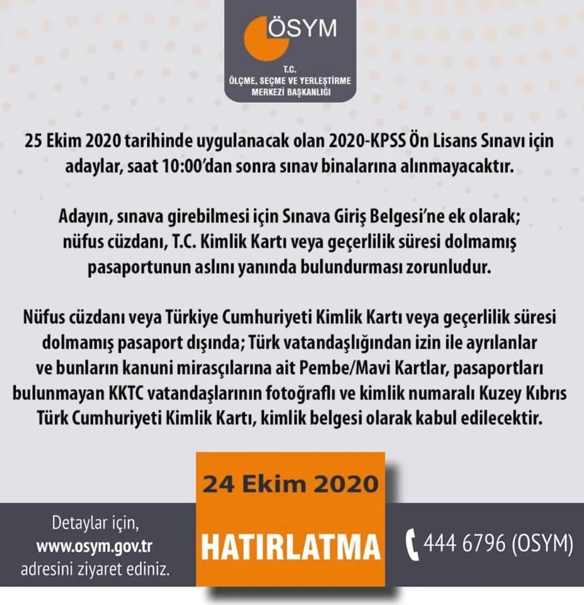 25 Ekim 2020 tarihinde uygulanacak olan KPSS ön lisans sınavı için araştırmalar hız kesmeden devam ediyor. Sınav yerlerinin 14 Ekim tarihinden itibaren erişime açılması ile birlikte KPSS sınavı kaç dakika sürecek, saat kaçta gibi araştırmalar tam bu noktada önem kazanır hale geldi. Adayların sınava girebilmeleri için yanlarında sınav giriş belgelerinin bulunması da zorunlu olmaktadır. Peki; KPSS ön lisans sınavı saat kaçta yapılacak, kaç dakika sürecek? Haberimizin içerisinden KPSS ön lisans sınav yerleri sorgulama ekranı ve detaylarına ulaşabilirsiniz.