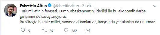 Cumhurbaşkanlığı İletişim Başkanı Altun yaptığı açıklamada, "Türk milletinin feraseti, Cumhurbaşkanımızın liderliği ile bu ekonomik darbe girişimini de savuşturuyoruz. Bu süreçte bu aziz millet, yanında duranları da karşısında yer alanları da unutmaz" ifadelerini kullandı.