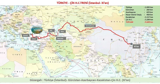 Ulaştırma ve Altyapı Bakanı Karaismailoğlu, trenin, Türkiye'de 2 bin 323 kilometre, Gürcistan'da 220 kilometre, Azerbaycan'da 430 kilometre, Hazar Denizi'nde 420 kilometre, Kazakistan'da 3 bin 200 kilometre ve Çin'de 2 bin 100 kilometre olmak üzere toplamda 8 bin 693 kilometre yol kat edeceğini söyledi.