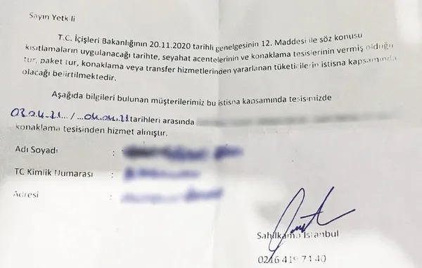 İçişleri Bakanlığı'nın 20.11.2020 tarihli genelgesinin 12. maddesine göre, kısıtlamaların uygulanacağı tarihlerde seyahat acenteleri ve konaklama tesislerinin vermiş olduğu tur, paket tur, konaklama veya transfer hizmetlerinden yararlanan tüketiciler bu kısıtlamalardan istisna tutuluyor. Maddeye göre vatandaşların tesiste konaklaması şartı bulunuyor. Böylece tesisin imkânlarından faydalanabiliyor. Ancak sistemdeki boşluğu fırsata çeviren bazı oteller ve vatandaşlar, sahte rezervasyon ve kağıt üstünde kalan konaklama belgeleriyle bazı tesislerde günübirlik zaman geçiriyor. Sistemdeki boşluk şöyle işliyor: Pazar günü sokağa çıkma yasağını delmek için gidilecek bölgedeki herhangi bir otelde, online bir rezervasyon sitesinden ücretsiz iptal hakkıyla rezervasyon yapılıyor. Oradan alınan rezervasyon koduyla yola çıkılıyor. Olası bir polis kontrolünde ise bu kod gösteriliyor. Kahvaltı ya da yemek için gidilen butik otelde gün geçiriliyor, geri dönüşte ise yine otelde imzalı bir belge veriliyor. Dönüşte de bu belge polise gösteriliyor. Tamamen kağıt üstündeki belgeyle otel, hiç konaklama yaptırmadan müşteri almış oluyor.