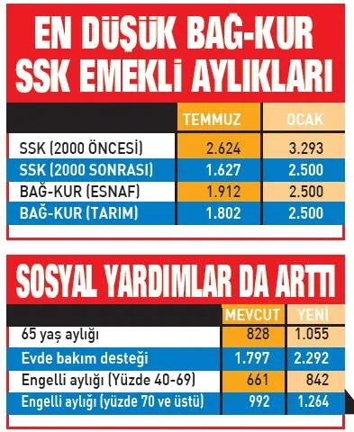 Diğer yandan SSK ve Bağ- Kur emeklilerinin aylıkları da geçen yılın son 6 aylık enflasyonu oranında artacak. Bu oran yaklaşık yüzde 25.5'e karşılık geliyor. Buna göre 2000 öncesi SSK emeklilerinin aylığı 2 bin 624 liradan 3 bin 293 liraya, 2000 sonrası da 1627 liradan 2 bin 500 liraya çıktı. Bağ- Kur (esnaf) emeklisinin aylığı 1912 liradan 2 bin 500 liraya, Bağ-Kur (Tarım) aylığı da 1802 liradan 2 bin 500 liraya yükseldi. Kamu işçilerine yüzde 25.6 oranında zam yapılacak.