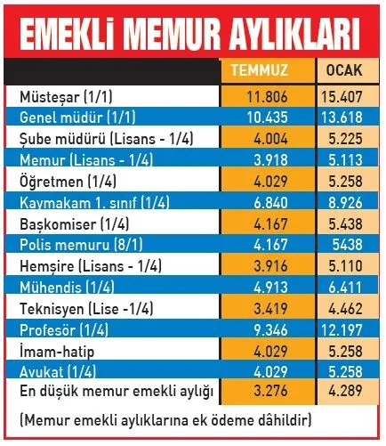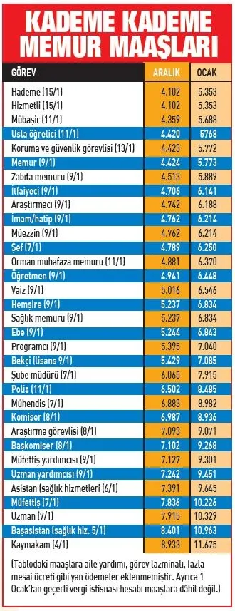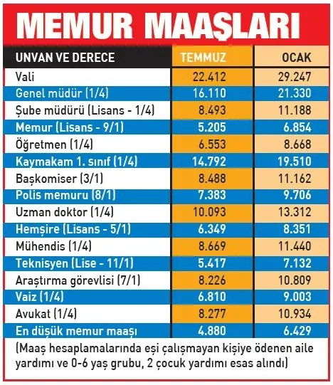 Enflasyon oranından kaynaklı ilave artışla beraber aile yardımı ödeneği dâhil (0-6 yaş grubu 2 çocuk yardımı esas alındı) en düşük memur maaşı 4 bin 880 liradan 6 bin 368 liraya çıktı. En düşük memur emekli aylığı da ek ödemelerle birlikte 3 bin 276 liradan 4275 liraya yükseldi. Kamuda çalışan bir genel müdür 21 bin 110 lira, şube müdürü 11 bin 126 lira, öğretmen (1/4) 8 bin 596 lira, başkomiser 11 bin 121 lira, polis memuru (8/1) 9 bin 742 lira alacak. Uzman doktor (1/4) maaşı 13 bin 214 lira, hemşire (5/1) maaşı 8 bin 341 lira, araştırma görevlisi maaşı da 10 bin 786 lira olacak.