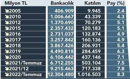 BDDK verilerine göre temmuz sonu itibarıyla son 1 yılda bankacılık sektörünün kredi hacmi yüzde 68 artarak 6.5 trilyon liraya çıkarken, katılım bankacılığının kullandırdığı fonlar ise yüzde 98'lik büyüme ile 487.5 milyara ulaştı. Aynı dönemde bankacılık sektörünün mevduat hacmi yüzde 90'lık büyüme ile 7 trilyon 457 milyara çıkarken, katılım bankacılığının topladığı fonlar ise yüzde 113.5 artarak 810.1 milyara ulaştı. Katılım bankacılığının mevduattaki payı yüzde 9.5'ten 10.8 yükseldi.