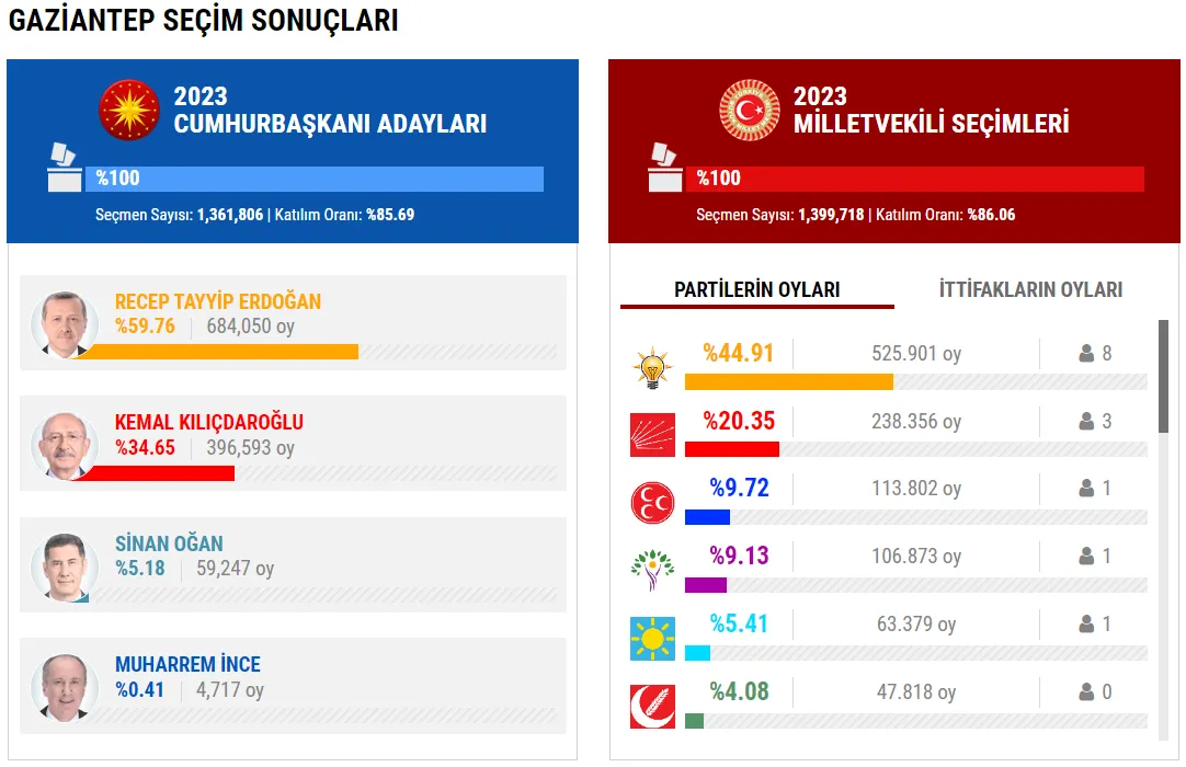 Gaziantep Seçim Sonuçları 2023 linkine tıklayarak adayların il genelinde ve ilçe bazında oy oranlarını öğrenebilirsiniz.