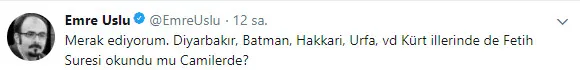 FETÖ'nün kalemlerinden Emre Uslu, camilerde Fetih suresi okunmasına tepki göstererek "Kürt illeri" olarak tanımladığı kentlerde de "Surenin okunup okunmadığını merak ettiğini, bu durumun camilerin ve dinin bölünmesi olduğunu" öne sürdü.
