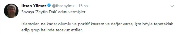 Firari diğer bir FETÖ'cü İhsan Yılmaz, "Savaşa 'Zeytin Dalı' adını vermişler. İslamcılar, ne kadar olumlu ve pozitif kavram ve değer varsa, işte böyle tepetaklak edip grup halinde tecavüz ettiler." iddiasında bulundu.