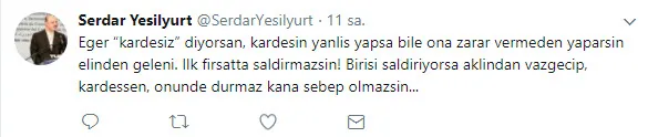 FETÖ ile bağlantılı olduğu için kapatılan Türkiye İş adamları ve Sanayiciler Federasyonunun (TUSKON) Brüksel temsilcisi Serdar Yeşilyurt da "Eğer 'kardeşiz diyorsan, kardeşin yanlış yapsa bile ona zarar vermeden yaparsın elinden geleni. İlk fırsatta saldırmazsın!" ifadesini kullandı.