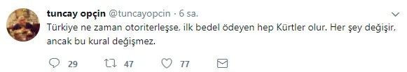 ABD'ye kaçan örgüt mensuplarından Tuncay Opçin, "Türkiye ne zaman otoriterleşse, ilk bedel ödeyen hep Kürtler olur. Her şey değişir ancak bu kural değişmez." iddiasında bulundu.