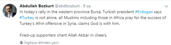 Cumhurbaşkanı Recep Tayyip Erdoğan'ın Bursa'da yaptığı konuşma sırasında tekbir getirilmesinden rahatsızlık duyan firari FETÖ'cü, "Gaza gelen destekçileri, coşku içinde Allahuekber sloganı attı." şeklinde yazdı.