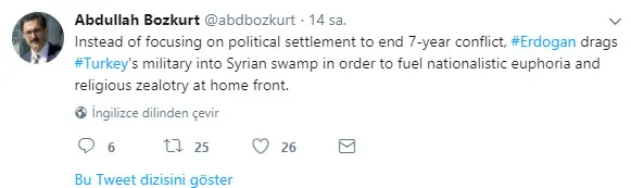 Eski Today's Zaman Ankara Temsilcisi FETÖ firarisi Abdullah Bozkurt, terör örgütlerine karşı Türkiye'yi desteklemek yerine, sosyal medya hesabında, harekatın "ülke içinde ulusal coşkuyu ve dini bağnazlığı körüklemek için yapıldığını" iddia etti.