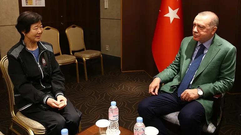 Erdoğan, başkent Seul'de konakladığı otelde, Ayla filminin gerçek kahramanı Eunja ile bir araya geldi.