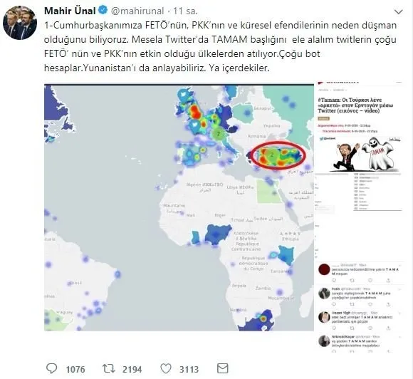 "Tamam" etiketinin paylaşım haritasını ve bot hesapların ekran görüntüsünü paylaşan Ünal şu açıklamayı yaptı: "Tweetlerin çoğu FETÖ ve PKK'nın etkin olduğu ülkelerden atılıyor. Çoğu bot hesaplar. Yunanistan'ı da anlayabiliriz. Ya içerdekiler. Muhalefeti itham altında bırakmak gibi bir kastım asla söz konusu olamaz ama muhalefetin Cumhurbaşkanımıza düşmanca saldıran Türkiye karşıtı güçlerle söylemini ayrıştırması gerekmez mi? Sandığın ne anlama geldiğini anlamayan klavye kahramanları, 24 Haziran gecesi görüşürüz."