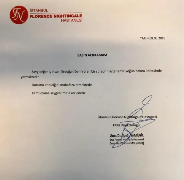 Erdoğan Demirören'in öldüğüne yönelik iddialar üzerine Demirören'in tedavi gördüğü Florence Nightingale hastanesinden açıklama geldi! İşte o açıklama...