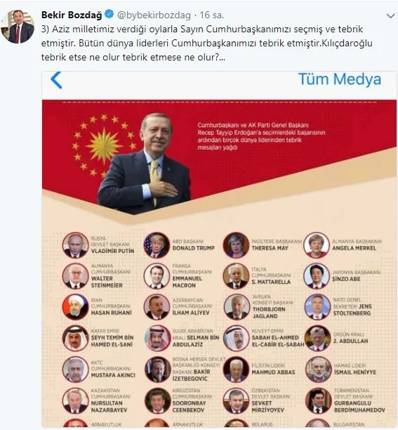 "Ne yazık ki Kılıçdaroğlu, milletin %52,6'sının oyunu alarak yeni sistemin ilk Cumhurbaşkanı seçilen Recep Tayyip Erdoğan'ı tebrik etmeyerek; demokrasiye, millet iradesine ve seçimlere inanmadığını ve de görgüsüzlüğünü bir kez daha ortaya koymuştur. Aziz milletimiz verdiği oylarla Sayın Cumhurbaşkanımızı seçmiş ve tebrik etmiştir. Bütün dünya liderleri Cumhurbaşkanımızı tebrik etmiştir.Kılıçdaroğlu tebrik etse ne olur tebrik etmese ne olur?"