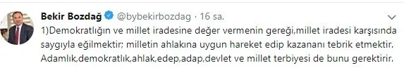 Başbakan Yardımcısı Bekir Bozdağ sosyal medya hesabı Twitter üzerinden yaptığı açıklamada "Demokratlığın ve millet iradesine değer vermenin gereği,millet iradesi karşısında saygıyla eğilmektir; milletin ahlakına uygun hareket edip kazananı tebrik etmektir. Adamlık, demokratlık, ahlak, edep, adap, devlet ve millet terbiyesi de bunu gerektirir" dedi.
