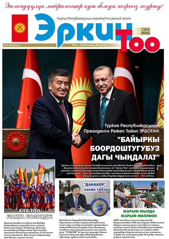 Cumhurbaşkanı Recep Tayyip Erdoğan, yarın gerçekleştireceği Kırgızistan ziyareti öncesinde ülkedeki Erkin Too gazetesi için Türk-Kırgız ilişkilerine dair bir değerlendirme kaleme aldı. "Ata Yurdu Kırgızistan'la Çok Yönlü Bağlarımızı Güçlendiriyoruz" başlıklı yazı, gazetenin hem manşetinde hem de iç sayfasında geniş şekilde yer aldı.