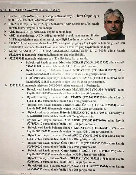 İddianamede; ABD İstanbul Başkonsolosluğu'nda 35 yıl çalışan Metin Topuz'un, 15 Temmuz gecesi Akıncı Üssü'nde darbe girişimini yöneten FETÖ'nün "hava kuvvetleri imamı" firari Adil Öksüz'ün bacanağı olan Erdal Şen'le 25 Eylül 2006 tarihinde telefon irtibatı olduğu bildirildi. Habertürk gazetesi eski Ankara Temsilcisi Erdal Şen, Adil Öksüz'ün kaçırılmasına ilişkin yardım ettikleri iddiasıyla tutuklanmış, 6 yıl 3 ay hapis cezasına çarptırılmıştı.