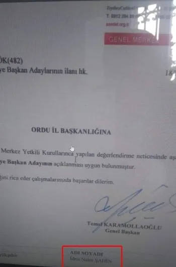 FETÖ'cü Şahin'in Ordu'dan Büyükşehir Belediye Başkan adaylığına ilişkin resmi başvurusu, Saadet Partisi (SP) Genel Başkanı Temel Karamollaoğlu imzasıyla yapıldı.