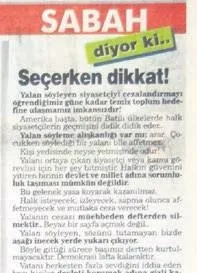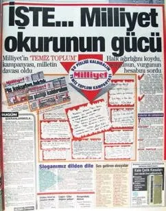 Milliyet-30 Eylül 1993: Ardı arkası kesilmeyen vurgunlara son vermek, milletin parasını calıp cırpanlara dur demek icin, ortbas edilen yolsuzlukları ortaya cıkarmak icin, soygunların, yapanın yanına kar kalmaması icin, sahtekarın yanında durustun da yanmaması icin, yolsuzluktan arınmış "Temiz Turkiye" icin, yazın, tepki gosterin, calanı, cırpanı, soyanı, vuranı, dolandıranı, ruşvet alanı acığa cıkarın.