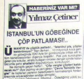 Milliyet yazarı Yılmaz Çetiner-19 Ağustos 1993: Umraniye'de copluk patladı!.. İstanbul pis, copler kaldırılmıyor!" filan derken... 10 milyonluk koca şehrin gobeğinde İSKİ oyle gumburtuyle infilak etti ki, tum kanalizasyonları dışarıya boşalttı.