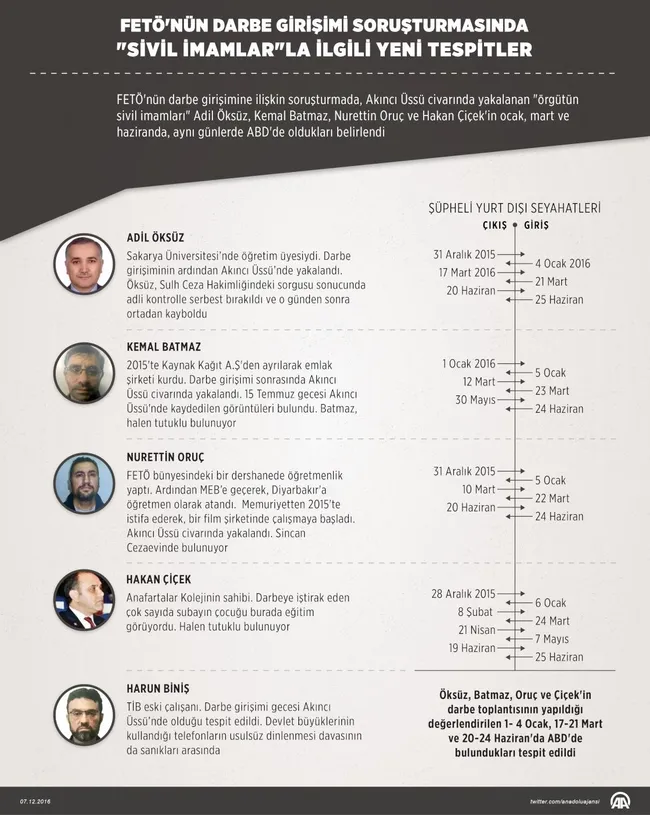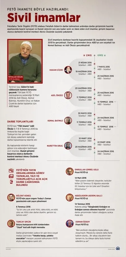 AA muhabirinin darbe girişimine ilişkin hazırlanan iddianame, mütalaa ve gerekçeli kararlardan derlediği bilgilere göre, FETÖ elebaşı Gülen'in darbe talimatının ardından sivil imamlar Adil Öksüz, Kemal Batmaz, Nurettin Oruç, Hakan Çiçek ve Harun Biniş, aylar öncesinden hazırlıklara başladı.