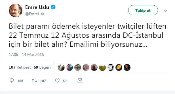 Diğer firari FETÖ'cü Emrullah (Emre) Uslu da 14 Mart 2016'da, "Bilet paramı ödemek isteyenler, twitçiler lütfen 22 Temmuz 12 Ağustos arasında DC-İstanbul için bir bilet alın. Emailimi biliyorsunuz." paylaşımında bulunarak darbe girişiminin üyesi olduğu örgüt tarafından yapılacağını açıkça yazdı.
