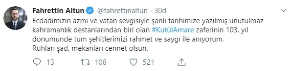 Cumhurbaşkanlığı İletişim Başkanı Prof. Dr. Fahrettin Altun, "Ecdadımızın azmi ve vatan sevgisiyle şanlı tarihimize yazılmış unutulmaz kahramanlık destanlarından biri olan Kut'ül Amare Zaferi'nin 103'üncü yıl dönümünde tüm şehitlerimizi rahmet ve saygı ile anıyorum." ifadelerini kullandı.