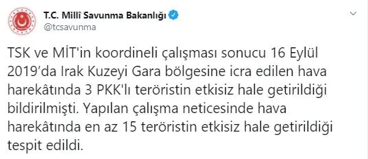 Bakanlığın Twitter adresinden yapılan açıklamada, "TSK ve MİT'in koordineli çalışması sonucu 16 Eylül 2019'da Irak Kuzeyi Gara bölgesine icra edilen hava harekâtında 3 PKK'lı teröristin etkisiz hale getirildiği bildirilmişti. Yapılan çalışma neticesinde hava harekâtında en az 15 teröristin etkisiz hale getirildiği tespit edildi" denildi.