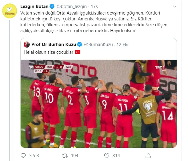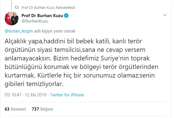 Lezgin Botan'a 'Alçaklık yapa,haddini bil bebek katili, kanlı terör örgütünün siyasi temsilcisi,sana ne cevap versem anlamayacaksın. Bizim hedefimiz Suriye'nin toprak bütünlüğünü korumak ve bölgeyi terör örgütlerinden kurtarmak' şeklinde cevap veren Burhan Kuzu, 'Kürtlerle hiç bir sorunumuz olamaz; senin gibileri temizliyorlar' ifadeleriyle de sosyal medyada gündem oldu.