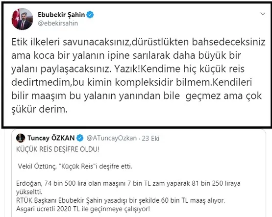 CHP-FETÖ'nün medyadaki kara propagandasına daha fazla dayanamayan RTÜK Başkanı Ebubekir Şahin'den sert bir açıklama geldi. Şahin, kişisel Twitter hesabından, CHP Genel Başkan Yardımcısı Tuncay Özkan'ın iftira cümlelerini de etiketleyerek "Etik ilkeleri savunacaksınız, dürüstlükten bahsedeceksiniz ama koca bir yalanın ipine sarılarak daha büyük bir yalanı paylaşacaksınız. Yazık! Kendime hiç küçük reis dedirtmedim, bu kimin kompleksidir bilmem. Kendileri bilir maaşım bu yalanın yanından bile geçmez ama çok şükür derim." paylaşımını yaptı.
