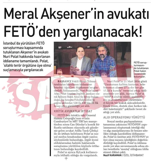 İddianamede, FETÖ'den tutuklu eski General Hamza Celepoğlu'nun evinin Cumhuriyet'in MİT TIR'ları manşetinden sonra Can Dündar'a komik bir fiyatla satılması olayında adı gündeme gelen avukat Atilla Tarık Çilekçi ile de irtibatı belirlenen Polat'ın sosyal medya hesabından örgüt yanlısı söylemlerde bulunduğu, örgüt üyesi olduklarından bahisle haklarında soruşturma yürütülen kişilerle irtibatının bulunduğu kaydedilmişti.
