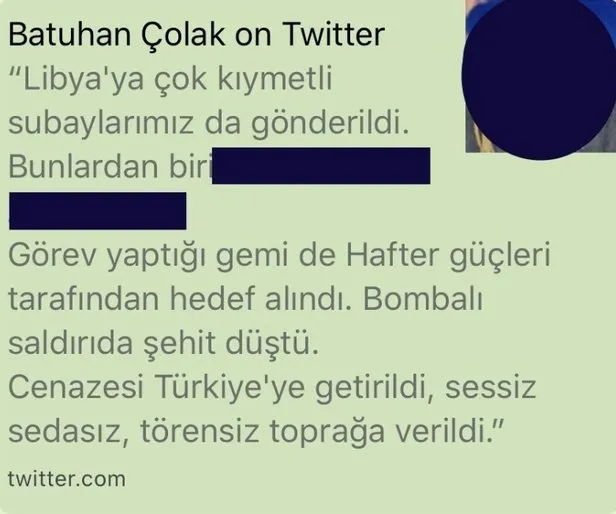 Yeniçağ Gazetesi'nin internet sitesi Genel Yayın Yönetmeni ve gazetenin yazarı Batuhan Çolak da, sosyal paylaşım sitesi Twitter'daki şahsi hesabından, yurt dışında görevli olan istihbarat görevlisinin ismini ve fotoğrafını paylaştı. Çolak, "Libya'ya çok kıymetli subaylarımız da gönderildi. Bunlardan biri --- --- Görev yaptığı gemide Hafter güçleri tarafından hedef alındı. Bombalı saldırı da şehit düştü. Cenazesi Türkiye'ye getirildi. Sessiz, sedasız, törensiz toprağa verildi" ifadelerini kullandı.